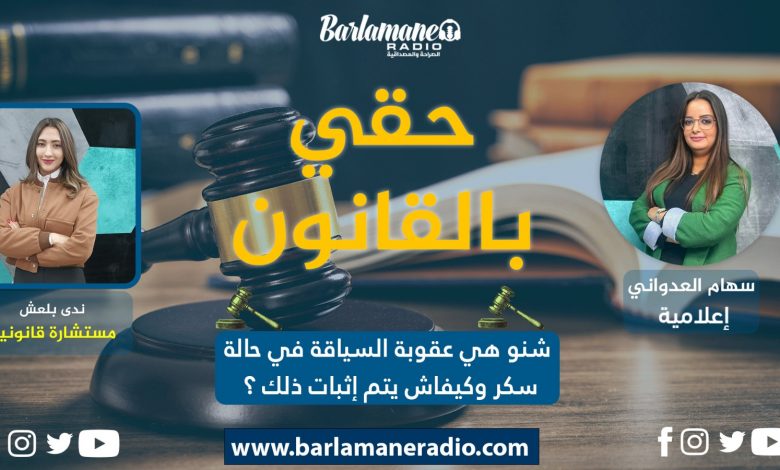 استضافت الزميلة سهام العدواني، خلال حلقة هذا الأسبوع من برنامج حقي بالقانون، والتي حملت عنوان “حقي بالقانون.. شنو هي عقوبة السياقة في حالة السياقة وكيفاش يتم إثبات ذلك؟”، المستشارة القانونية، ندى بلعش.