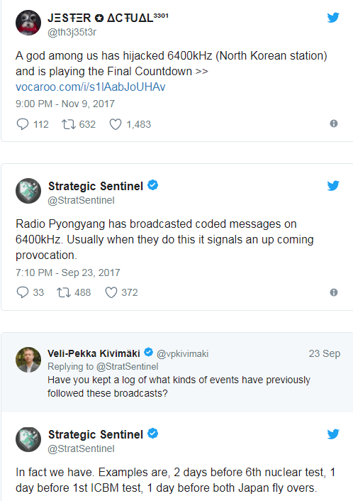 وتم الكشف عن هذا الاختراق من قبل الهاكر الشهير “TheJester“، إذ كتب عبر حسابه الرسمي على تويتر: “تم اختراق محطة إذاعية بكوريا الشمالية 6400kHz وتشغيل أغنية “TheFinal Countdown“.