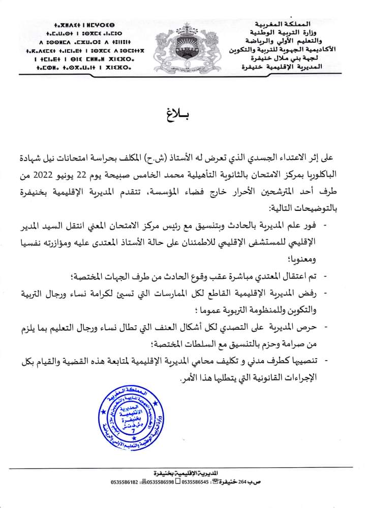 وحسب بلاغ للمديرية الإقليمية لوزارة التربية الوطنية بإقليم خنيفرة، توصل موقع “برلمان.كوم” بنسخة منه، فقد تسبب الاعتداء في نقل الأستاذ إلى المستشفى، حيث قام المدير الاقليمي رفقة وفد بزيارة تضامنية له، للإطمئنان على وضعه الصحة، ومؤازرته نفسيا ومعنويا.