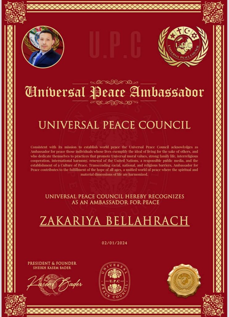 في سياق افتتاح المجلس العالمي للسلام، للعام الجديد بسلسلة من التعيينات المهمة، ما يبرز التزامه نحو تعزيز السلام والحوار بين الأديان والثقافات على الصعيدين الوطني والدولي، أعلن المجلس، أول أمس الثلاثاء، تعيين المغربي زكرياء بلحرش سفيرا للسلام والحوار بين الأديان والثقافات ببلادنا.
