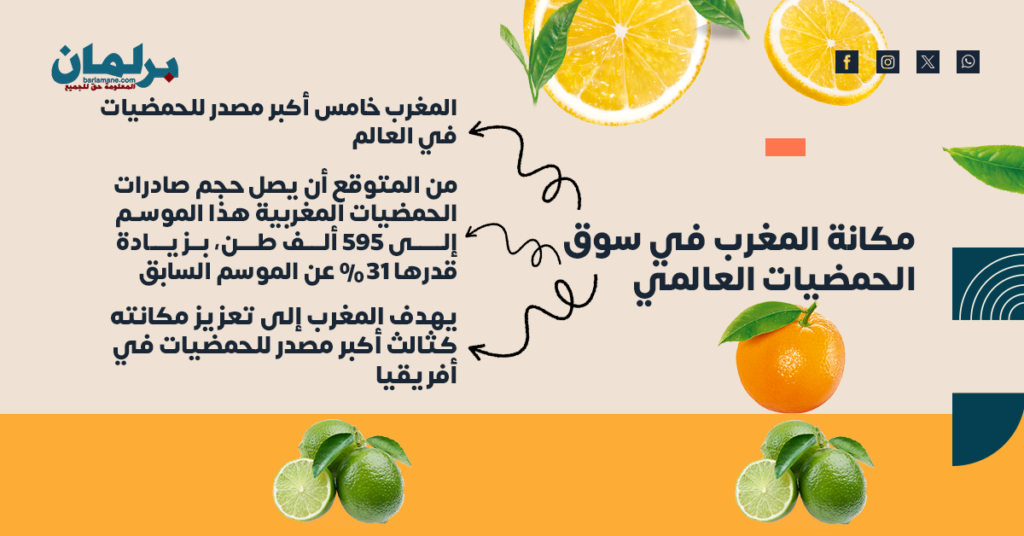 ومن المتوقع أن تصل صادرات الحمضيات المغربية هذا الموسم إلى 595 ألف طن، بزيادة قدرها 31% مقارنة بالعام السابق، مما يُرسّخ مكانة البلاد كثالث أكبر مُصدّر للحمضيات في أفريقيا بعد جنوب أفريقيا ومصر.