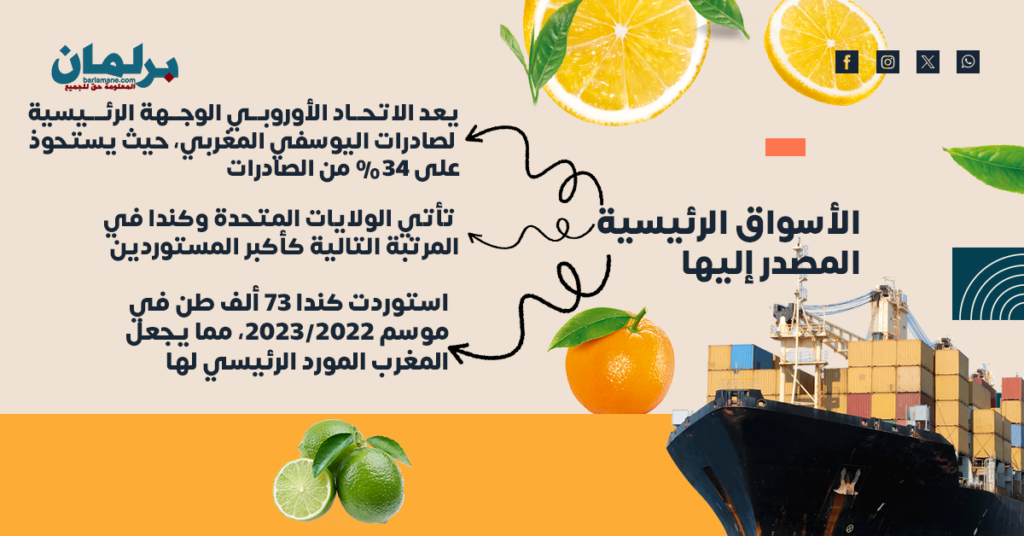 ويُعد الاتحاد الأوروبي أكبر وجهة لليوسفي المغربي، حيث يستحوذ على 34% من الصادرات، تليه الولايات المتحدة وكندا. وخلال موسم 2022/2023، استوردت كندا رقما قياسيا بلغ 73 ألف طن، مما جعل المغرب المورد الرئيسي لها.