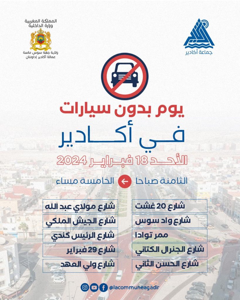 وتشمل مبادرة ” يوم بدون سيارات في أكادير” كذلك كلا من ممر توادا، شارع الرئيس كندي، شارع الجنرال الكتاني، شارع 29 فبراير، شارع الحسن الثاني، وشارع ولي العهد.