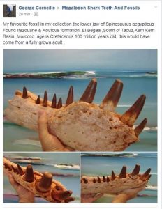 ونشر تاجر التحف الإيرلندي الجنسية، والمدعو جورج كورنيل إعلاناً على إحدى صفحات الفايسبوك، يعرض بيع أجزاء من الديناصور النادر ومنشأه المغرب، حيث عبر عن استعداده لبيع قطع من الهيكل، والتي يصل عمرها إلى 100 مليون سنة، مرفقاً إعلانه على الصفحة لبيع الحفريات على فيس بوك بصور لقطعة صغيرة من فك الديناصور الذي عثر عليه بالمغرب،وفق ما أوردت يومية “الصباح” في حدد اليوم الأربعاء.