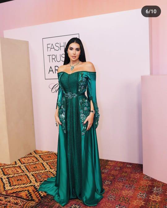 أما النجمة المصرية ياسمين صبري، فقد اختارت تصميم فستان بأسلوب القفطان، جاء مفتوحاً عند الأكتاف باللون الأخضر، ومزركشاً ومزخرفاً بطريقة فنية.