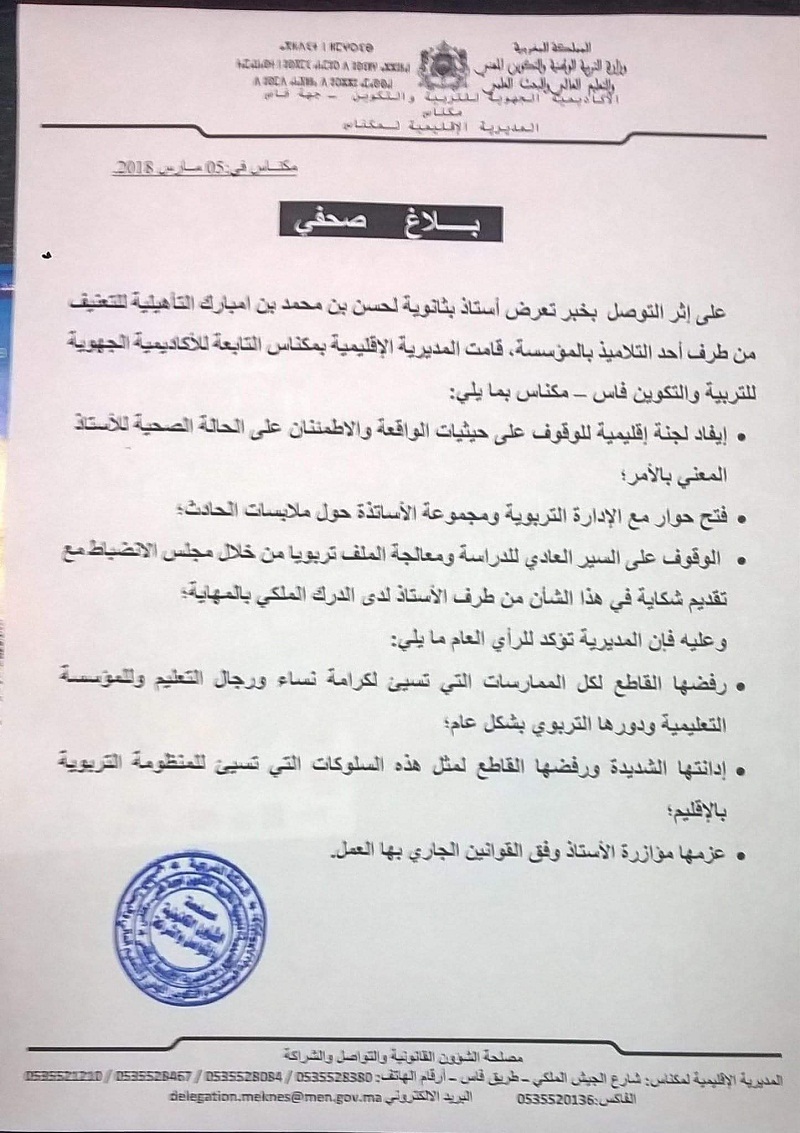 بدورها دخلت مديرية التعليم بمكناس على الخط، حيث أعلنت في بلاغ لها صدر يوم الإثنين الماضي، عن دعمها للأستاذ، كما أوفدت إلى الثانوية لجنة للوقوف على حيثيات القضية وكذا الحالة الصحية لهذا الأخير.