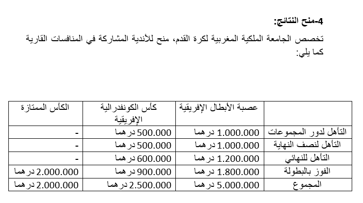 وتضمنت المبالغ المكافآت ومصاريف التنقل والأكل التي تخصصها الجامعة الملكية للفرق المتأهلة من البطولة الوطنية إلى الأدوار الطلائعية في المنافسات القارية وخصوصا، كأس عصبة الأبطال، والكأس الكونفدرالية، وكأس السوبر الإفريقية.