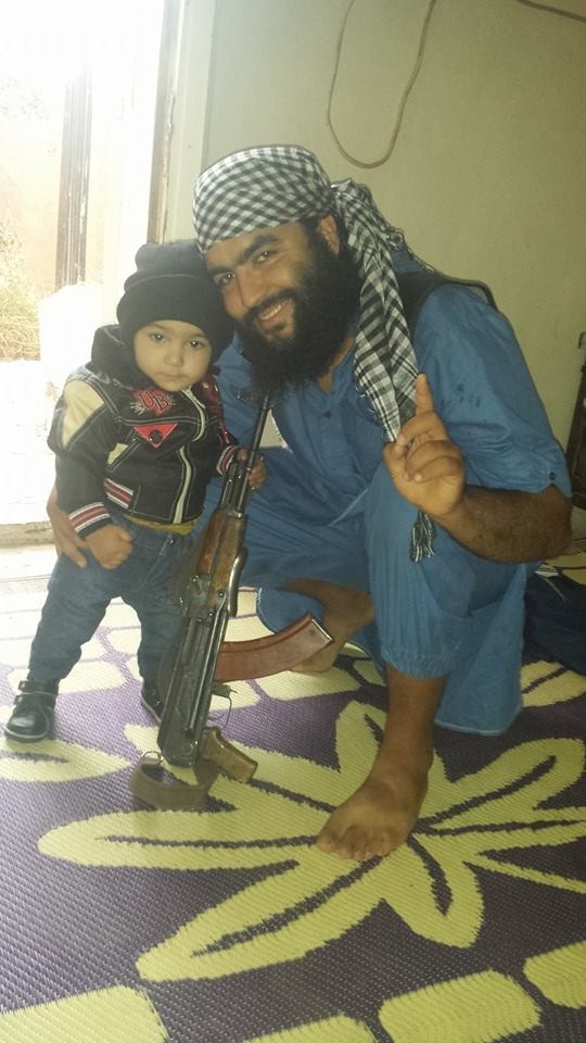 و يظهر “الداعشي المغربي” في هذه الصور التي التقطها في سوريا هو يقاتل إلى جانب تنظيم “داعش” متباهيا بالسلاح رفقة إبنه الصغير المزداد سنة 2013 .