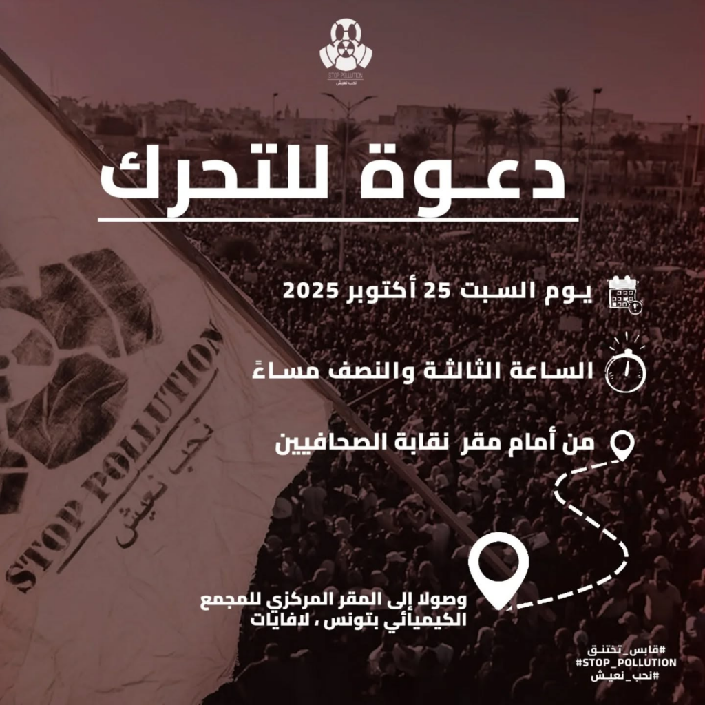 دعت حملة “أوقفوا التلوث – Stop Pollution” بتونس، مختلف مكوّنات المجتمع المدني والمنظمات الاجتماعية والمهتمين بقضايا العدالة المناخية، للمشاركة الواسعة في المسيرة الشعبية السلمية المقرر تنظيمها يوم السبت 25 أكتوبر 2025، انطلاقا من الساعة الثالثة والنصف مساءً.