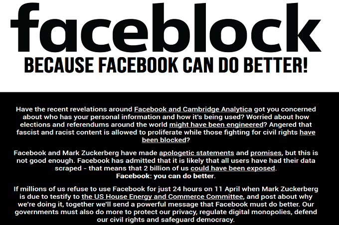 من المنتظر أن يدلي “مارك زوكربيرج”، المؤسس المشارك والرئيس التنفيذي لشركة “فيسبوك”، بشهادته أمام الكونغرس حول خصوصية البيانات يوم الأربعاء المقبل 11 أبريل، وفي نفس اليوم، من المنتظر أن تنطلق حملة Faceblock، وهي دعوة لمقاطعة “فيسبوك” لمدة يوم واحد، والتي تدعو أيضا لمقاطعة التطبيقات المرتبطة بها مثل “ماسنجر” و”واتس آب” و”إنستجرام”.