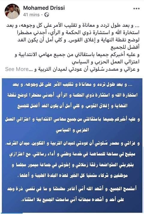 وأضاف رئيس المجلس البلدي لميسور على متن تدوينة نشرها على موقع التواصل الاجتماعي فيسبوك: “أخبركم جميعا باستقالتي من جميع مهامي الانتدابية واعتزالي العمل الحزبي والسياسي”، مضيفا بالقول: “وعزائي ومصدر سُـلوتي أن عودتي لميدان التربية والتكوين، ميدان الشرف، سيتيح لي مساحة للمساهمة في خدمة وطني وأداء رسالتي، مع اعتزازي بتجربتي المتواضعة رفقة زملائي وإخوتي في جماعة ميسور مجلسا وموظفين وشركاء متمنيا كل الخير لهذه البلدة الطيبة و أهلها”.