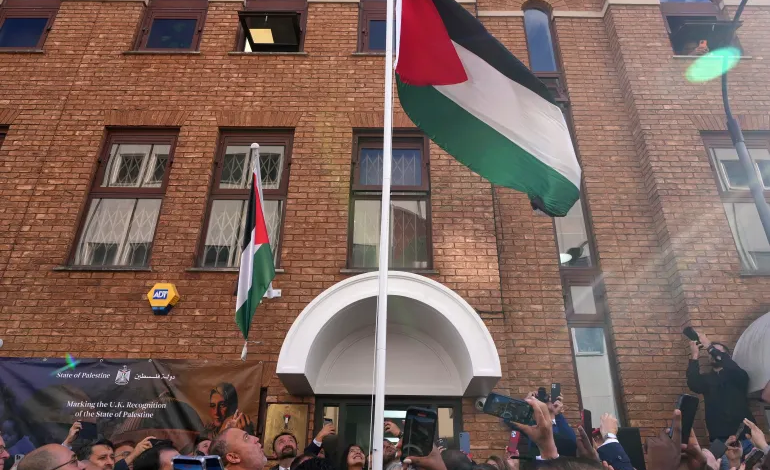 رفع العلم الفلسطيني، اليوم الإثنين 22 شتنبر 2025، على مبنى البعثة الفلسطينية في العاصمة البريطانية لندن بعد اعتراف بريطانيا بالدولة الفلسطينية.