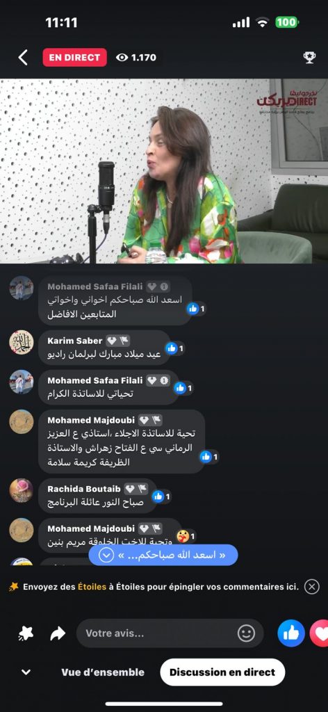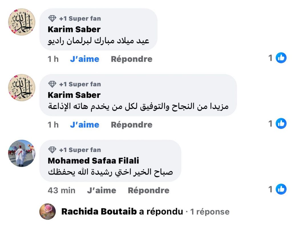 وهنأت عائلة برنامج “نخرجو ليها ديريكت” من خلال تعاليقها على حلقة يومه السبت، كل طاقم البرنامج، بمناسبة الذكرى السنوية الثالثة، لإطلاق إذاعة “برلمان راديو”، متمنين التوفيق والسداد والاستمرارية للإذاعة ولجميع أفراد الطاقم.