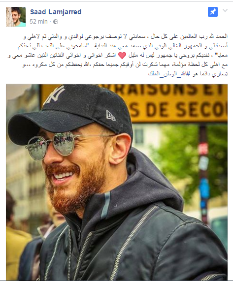 وفي تدوينته التي نشرها منذ دقائق، قال المجرد: “الحمد لله رب العالمين على كل حال ، سعادتي لا توصف برجوعي لوالدي و والدتي ثم لأهلي و أصدقائي و الجمهور الغالي الوفي الذي صمد معي منذ البداية… سامحوني على التعب للي تعبتكم معايا ، نفديكم بروحي يا جمهور ليس له مثيل اشكر اخواني و اخواتي الفنانين الذين عاشو معي و مع اهلي كل لحظة مؤلمة، مهما شكرت لن أوفيكم جميعا حقكم ،الله يحفظكم من كل مكروه ،،،و شِعاري دائما هو الله الوطن الملك”.