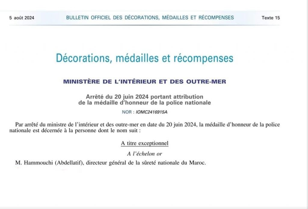 صدر بالجريدة الرسمية الفرنسية، مطلع شهر غشت الجاري، قرار وزير الداخلية وشؤون ما وراء البحار الفرنسي، المتعلق بمنح وسام الشرف من الدرجة الذهبية بصفة استثنائية لعبد اللطيف حمّوشي، المدير العام للأمن الوطني والمديرية العامة لمراقبة التراب الوطني.