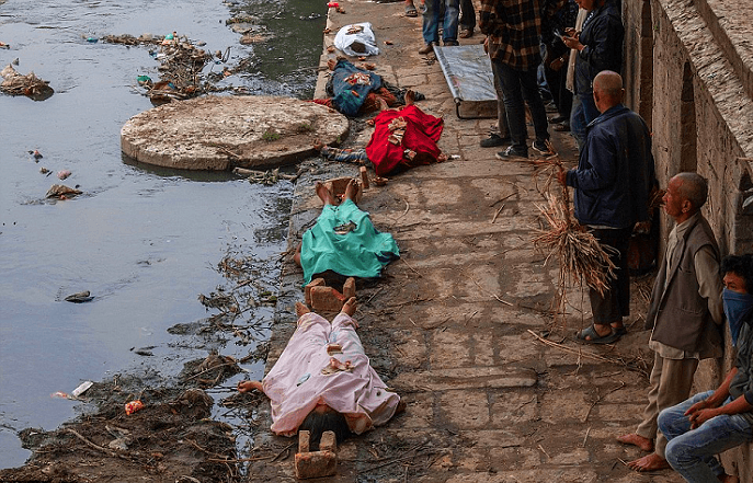 كما التقطت عدسات الكاميرا، صور فقراء معدومين، ظلت جثامينهم ملقاة على الأرض، تنتظر المحسنين الذين سيقومون بحرقها، لكون عملية الحرق كعملية الدفن في باقي بلدان العالم، لها أجراء وعمال يتقاضون أجرا للقيام بها.