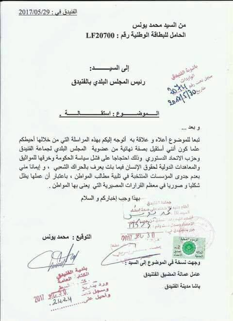 ونشر المستشار الجماعي بالمجلس البلدي لمدينة الفنيدق محمد يونس، نص استقالة وجهها لرئيس المجلس، كتب فيها أنه “يستقيل بصفة نهائية من عضوية المجلس البلدي لجماعة الفنيدق، وحزب الاتحاد الدستوري”.