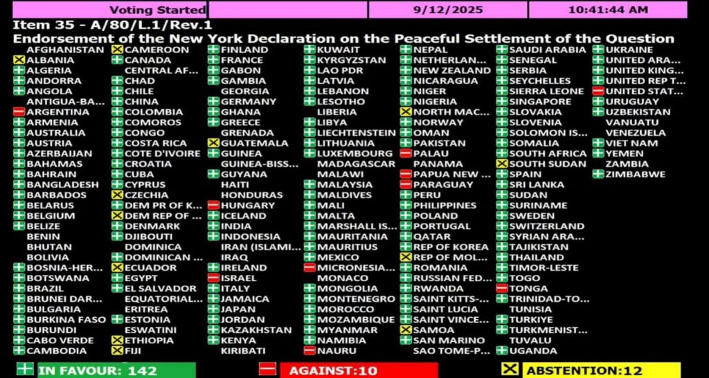 وتصويت الجزائر لصالح إعلان نيويورك يفضح بوضوح أن ما يهم النظام العسكري ليس فلسطين ولا المقاومة، بل البحث عن موطئ قدم ديبلوماسي وسط المبادرات التي تقودها قوى كبرى، أما الشعب الجزائري، الذي يُغذّى يوميا بخطاب الكراهية والتعبئة الفارغة، فسيظل ضحية لهذه الازدواجية الفاضحة.
