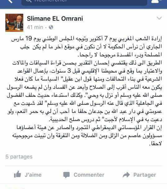 وأضاف العمراني في تدوينة على جداره بـ “فيسبوك”، إن “إرادة الشعب المغربي يوم 7 أكتوبر وتوجه المجلس الوطني يوم 19 مارس الجاري تقول أن نرأس الحكومة لا أن نكون في موقع آخر ما لم يكن جلب المصلحة ودرء المفسدة مرجوحا لا راجحا”.