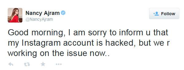 من ناحيتها أكَّدت نانسي خبر سرقة حسابها في تغريدة لها على تويتر كتبت فيها : “صباح الخير، أنا آسفة لأبلغكم أنه تم اختراق حسابي عبر موقع إنستجرام، ولكن نعمل على الأمر لاستعادته الآن”.
