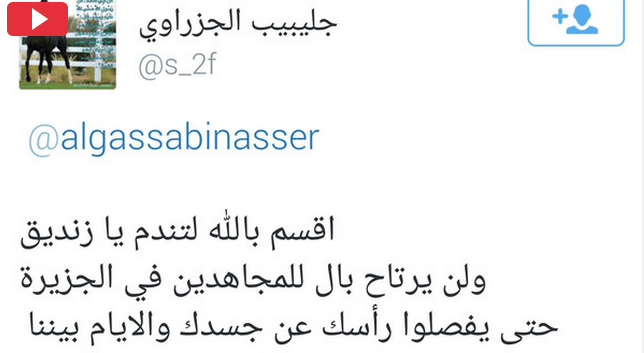 كما غرد نفس الحساب الذي هدد ناصر القصبي عبر هاشتاق أطلقه بعنوان مطلوب رأس ناصر القصبي للمجاهدين، حيث كتب تحته “تكفون يا مجاهدي الجزيرة نريد رأس هذا الخبيث، جزوا الرؤوس لنصرة الدين”.