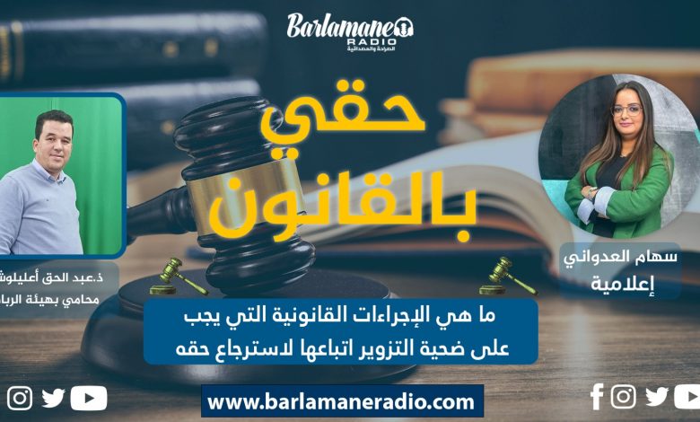 حلقة هذا الأسبوع التي حملت عنوان “حقي بالقانون.. ما هي الإجراءات القانونية التي يجب على ضحية التزوير اتباعها لاسترجاع حقه” استضافت خلالها الزميلة سهام العدواني، ذ. عبد الحق اعليلوش محامي بهيئة الرباط.