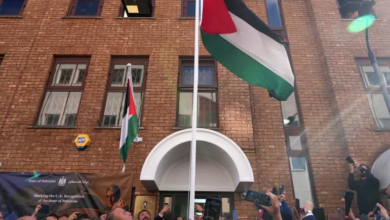رفع العلم الفلسطيني على مبنى البعثة الفلسطينية في لندن