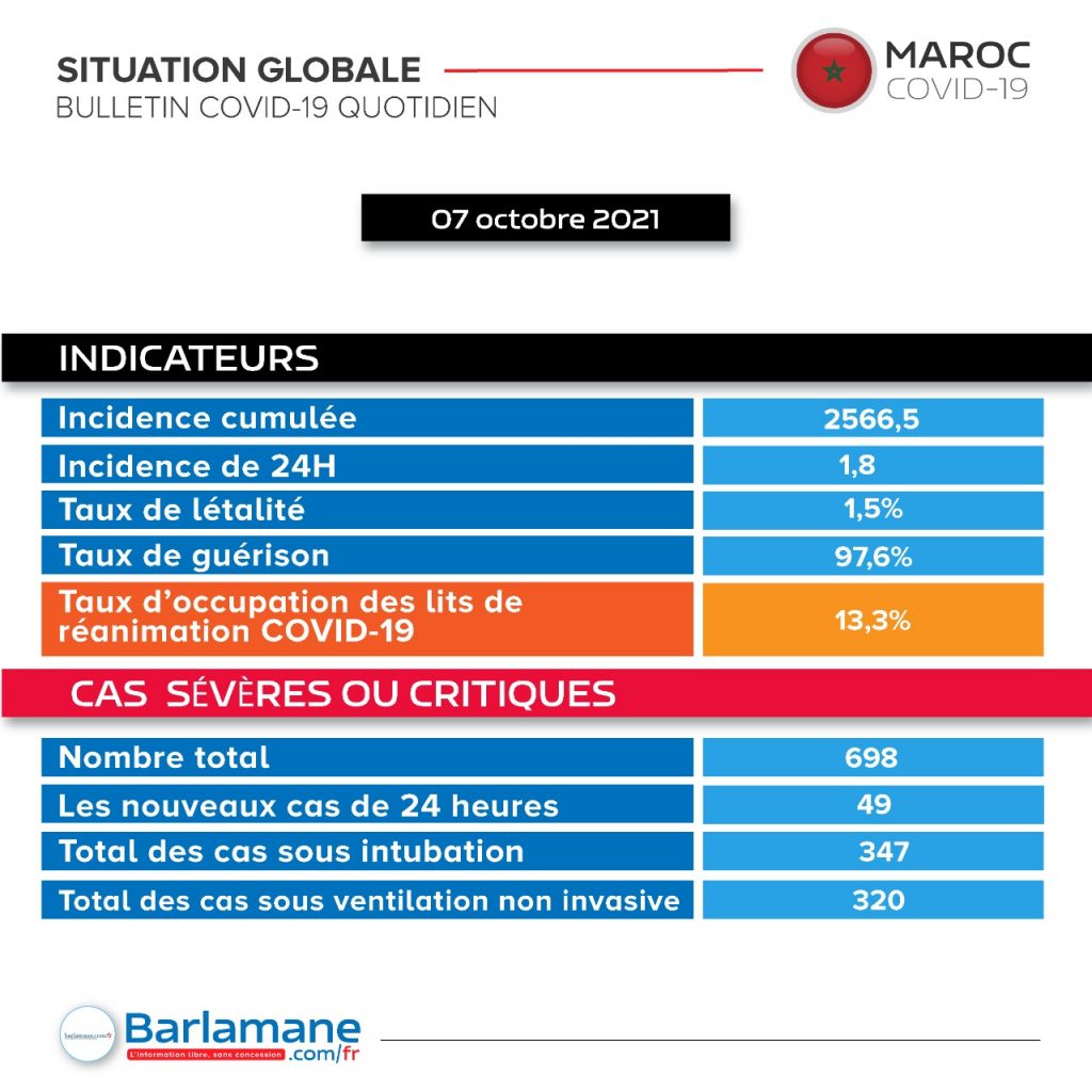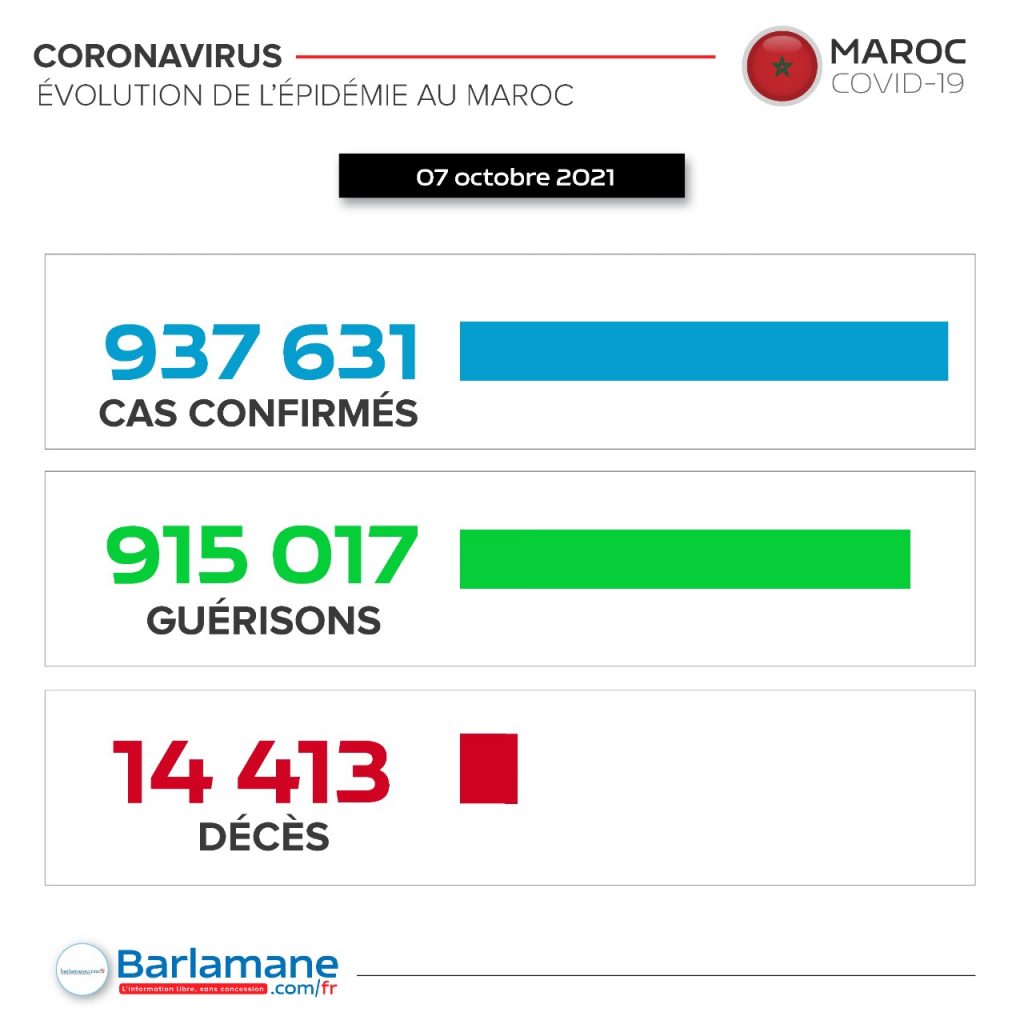 Le nouveau bilan des cas positifs porte à 937.631 le nombre total des contaminations depuis le premier cas signalé en mars 2020. Le nombre des personnes rétablies est passé à 915.017 , soit un taux de guérison de 97,6%.