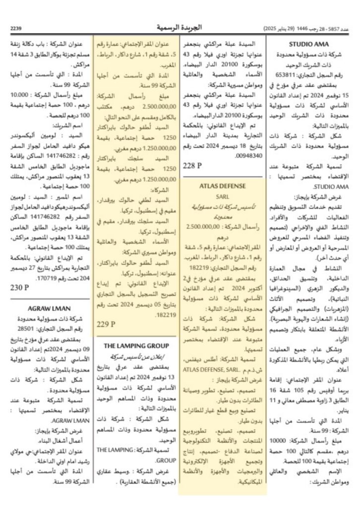 Spécialisée, d’après le Bulletin officiel, dans la fabrication de machines d’usage spécifique, Atlas Defense est détenue à parts égales par Lütfü Haluk Bayraktar et Selçuk Bayraktar, qui ont chacun apporté 1,25 million de dirhams et qui aspirent à s’imposer comme un acteur majeur dans la conception et la production de systèmes aéronautiques et de technologies de défense.