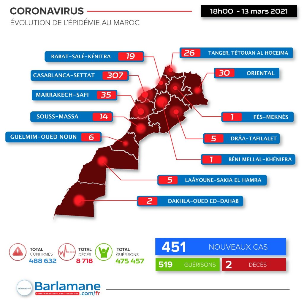 Un total de 451 nouveaux cas d’infection au coronavirus et de 519 guérisons a été enregistré au cours des dernières 24 heures au Maroc, a annoncé vendredi le ministère de la Santé.