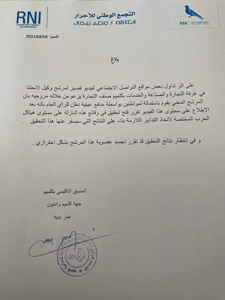 Ce communiqué du RNI, dont Barlamane.com détient une copie, indique le gel de l’adhésion dudit candidat, dans l’attente des résultats de l’enquête.