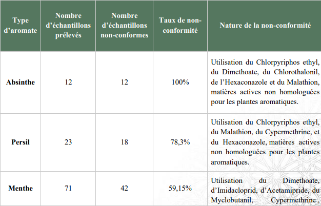 En termes d’usage de pesticides, malgré la mise en place d’une nouvelle norme, en juillet 2019, plus restrictive quant à la concentration de pesticides, la CDC relève que 100% de l’absinthe consommée dans le pays est non conforme aux normes sanitaires. Il en est de même pour 59% de la menthe, 78% du persil et 36% de la coriandre sur le marché marocain.