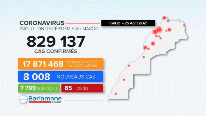 Quant aux décès, leur nombre total est passé à 12.176 (létalité 1,5%), avec 97 nouveaux cas, enregistrés dans les régions de Casablanca-Settat (16), Tanger-Tétouan-Al Hoceima (16), Marrakech-Safi (14), Rabat-Salé-Kénitra (11), Souss-Massa (10), l’Oriental (8), Béni Mellal-Khénifra (5), Drâa-Tafilalet (5), Lâyoune-Sakia El Hamra (5), Fès-Meknès (3), Guelmim-Oued Noun (3) et Dakhla-Oued Eddahab (1).
