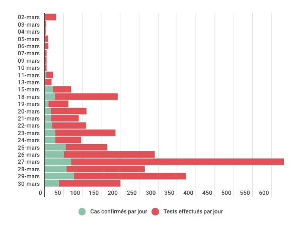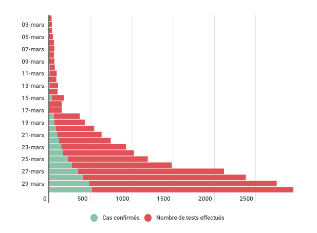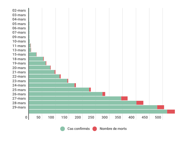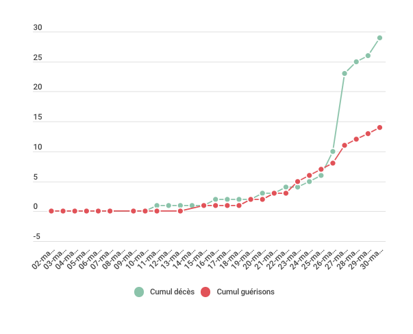 Avec 33 décès, le taux de létalité du covid-19 serait de 5,74%. Un taux « provisoire », parce qu’il est aujourd’hui difficile de le calculer sans connaître précisément le taux réel de population infectée. En effet, une large part des cas sont asymptomatiques et ne sont pas détectés, contribuant ainsi à la diffusion de la pandémie. Selon le ministère de la Santé, 82% des personnes décédées présentaient des facteurs de co-morbidité comme l’asthme, le diabète, l’hypertension et l’âge. et 85% des personnes décédées étaient dans un cas très critiques lors de leur prise en charge. La moyenne d’âge des décès est 66 ans.