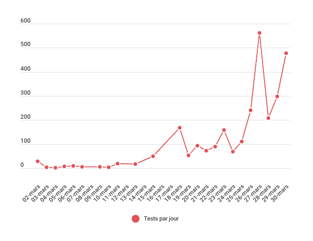 Jusqu’à présent, le Maroc a effectué 2.801 tests de dépistage, avec une moyenne de 99 tests par jour. Revenons au taux de mortalité de 5,74%. Il est haut. Cependant c’est un taux qui prend en considération le dénominateur de testés. Il est faible. Quelque 100 testés par jour depuis le début de la propagation de la pandémie jusqu’au 29 mars, où le nombre de testés a augmenté pour atteindre environ 300 personnes. Il est clair que si le Maroc avait opté pour un dépistage massif, la courbe de l’évolution de la maladie serait différente.