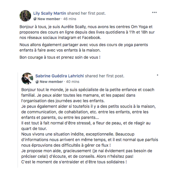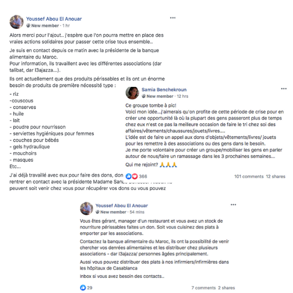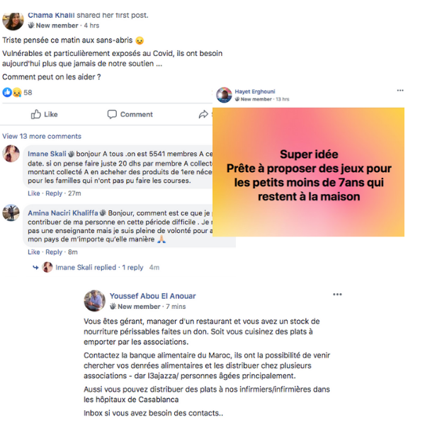 Les publications d’offres de service pullulent sur « LyedFlyed ». De nombreuses personnes, notamment des étudiants proposent par exemple de garder des enfants, d’autres d’aller faire des courses pour les personnes en isolement volontaire à la maison, des restaurateurs distribuent également des repas gratuits. De plus, plusieurs membres se sont proposés pour offrir denrées alimentaires et vestimentaires de première nécessité à des associations, des orphelinats, des hôpitaux et des maisons de retraite. Certains mettent leur expertise professionnelle à la disposition des personnes. Tel est le cas des psychologues qui veulent offrir aux personnes angoissées un espace de parole, d’écoute neutre et confidentiel afin de leur proposer un accompagnement psychique gratuit en ce temps de crise. Certains membres publient également des liens pour divertir les enfants privés de garderie et d’école. Face au coronavirus, la solidarité joue à plein. Ce groupe fait preuve que les Marocains sont aujourd’hui unis plus que jamais et que rien ne les empêchera de vivre et de créer du lien.