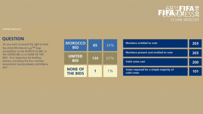 La candidature du trio nord-américaine a remporté l’organisation de la Coupe du Monde 2026. Le vote pour l’attribution du Mondial 2026 a été effectué ce mercredi à Moscou, aux travaux du 68e Congrès de la FIFA.