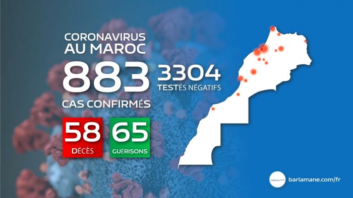 883 cas d’infection ont été détectés au Maroc depuis le début de l’épidémie qui a fait jusqu’à présent 58 morts et 65 guérisons, selon un bilan établi par le ministère de la Santé, aujourd’hui, à 18h00.