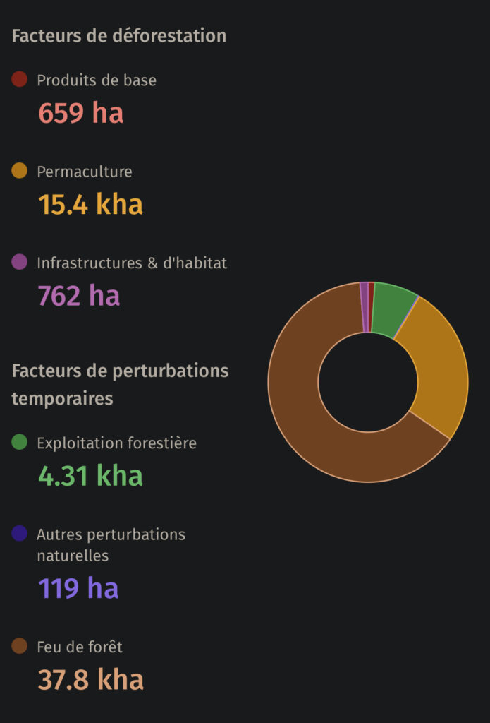 Le suivi de la période 2001-2024 révèle que «28 % de la perte de couvert arboré est attribuée à la déforestation, avec 659 hectares liés aux produits de base, 15 400 hectares à la permaculture et 762 hectares aux infrastructures et à l’habitat.» Les perturbations temporaires représentent un autre facteur majeur, car «l’exploitation forestière a concerné 4 310 hectares, les feux de forêt 37 800 hectares et d’autres perturbations naturelles 119 hectares.»