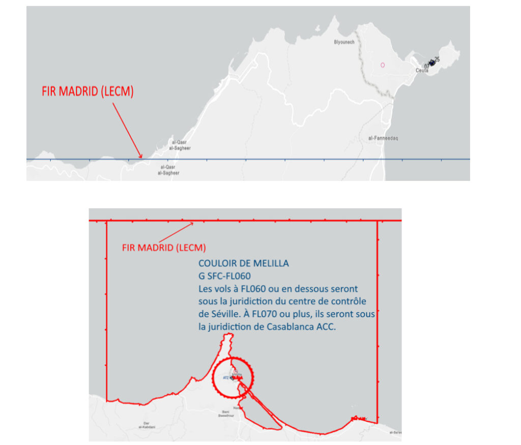 – Aéroport de Melilla : selon le cas, les vols sont opérés soit sous la juridiction du centre de contrôle de Séville, soit sous le contrôle de Casablanca.