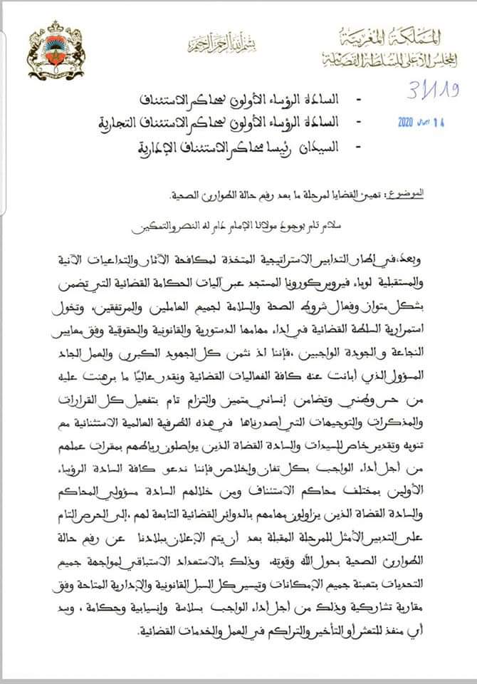 Les débats nationaux commencent à porter davantage sur la nécessité d’un plan de relance en sortie de crise, notamment en ce qui concerne la reprise des audiences des tribunaux. En effet, il a été décidé, depuis le 16 mars dernier, de suspendre la tenue des audiences de tous les tribunaux du Royaume à l’exception de celles en lien avec les affaires des détenus, les affaires en référé et les affaires d’instruction. Dans ce cadre, Mustapha Fares, Premier président de la Cour de cassation, s’est adressé aux Premiers présidents des Cours d’appel pour que les juges optent pour des jugements anticipés, en guise de plan post-coronavirus.