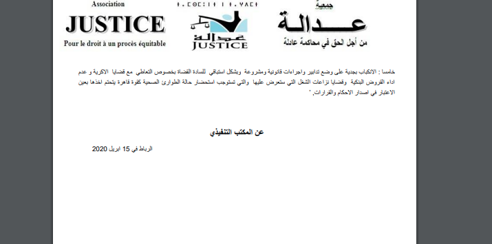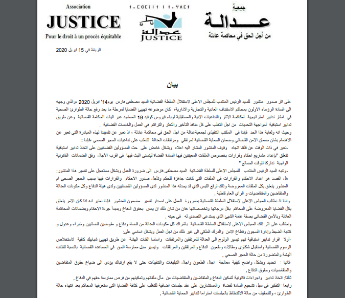 Dans ce sens, l’association Adala a publié un communiqué, dont Barlamane.com/fr détient une copie. L’organisation non gouvernementale, qui défend l’accès à la justice, salue l’initiative prise par M. Mustapha Fares qui vise à préparer le système judiciaire à sortir de la crise coronavirus. Elle demande également plus d’explications concernant le champ d’application des jugements anticipés. Et ce, pour une meilleure compréhension du contenu de la lettre du Premier président de la Cour de cassation.