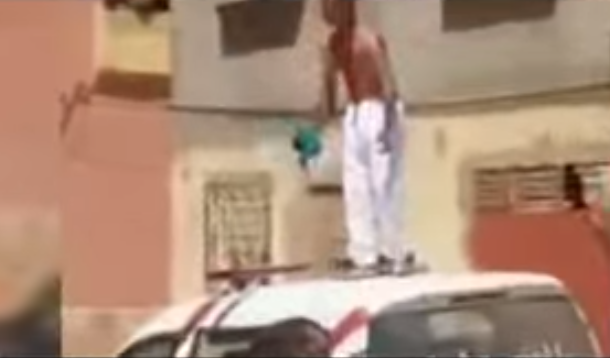 قاصر مضرج بالدماء يصعد فوق سيارة للأمن احتجاجا على مذكرة توقيف (فيديو)