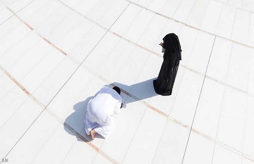 سعودي يُصلي في ظل زوجته بساحة الحرم المكي